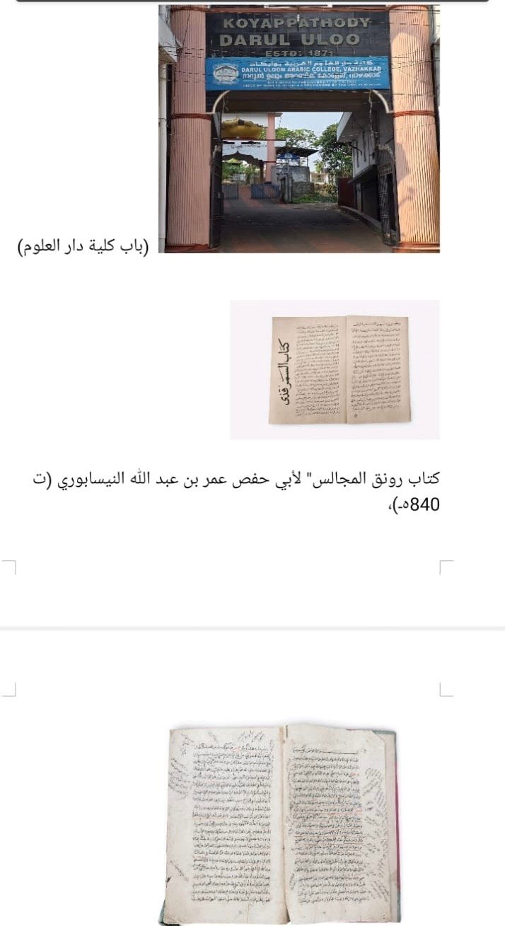 أما مكتبة دار العلوم هي كنزٌ من كنوز التراث؛ إذ تضم مخطوطاتٍ نفيسة ، ومن هذه المخطوطات كتاب “ذكر الموت” و”سراج القلوب وعلاج الذنوب” للشيخ زين الدين المعبري (ت 928هـ)، وهو من كتب الوعظ وتزكية النفس، وكذلك مخطوطة “رونق المجالس” لأبي حفص عمر بن عبد الله النيسابوري (ت 840هـ)، وهو من الكتب المعروفة في مجالس الوعظ والقصص. كما تحتوي المكتبة على مؤلفاتٍ في المذاهب الفقهية الأربعة، مما يدل على سعة أفق العلماء وحرصهم على التنوع العلمي. وقد تخرَّج في هذه المؤسسة عددٌ من العلماء البارزين، منهم الدكتور محيي الدين ألوائي، الذين أسهموا في خدمة اللغة العربية في كيرالا وخارجها.