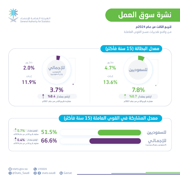 أما الشباب السعوديون الذكور، فقد شهد معدل مشاركتهم في القوى العاملة ارتفاعًا بمقدار 1.1 نقطة مئوية ليصل إلى 34.6%. وارتفع معدل مشاركة الذكور السعوديين في القوى العاملة بشكل عام بمقدار 0.6 نقطة مئوية ليصل إلى 66.9%، مع ارتفاع معدل المشتغلين إلى السكان ليبلغ 63.7%.