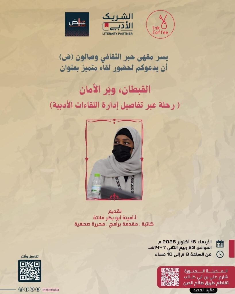 يستضيف مقهى حبر الثقافي بالتعاون مع صالون ضاد مساء الأربعاء 23 ربيع الآخر 1447هـ الموافق 15 أكتوبر 2025م لقاء ثقافيا مميزا بعنوان «القبطان، وبَر الأمان – رحلة عبر تفاصيل إدارة اللقاءات الأدبية»، تقدّمه الكاتبة والإعلامية الأستاذة أمينة أبو بكر فلاتة، التي تُعد من أبرز الأسماء النسائية في المشهد الثقافي والإعلامي بالمدينة المنوّرة، لما تمتلكه من خبرةٍ واسعةٍ في مجالات الكتابة وإدارة الحوارات الثقافية وتقديم البرامج الأدبية والثقافية.