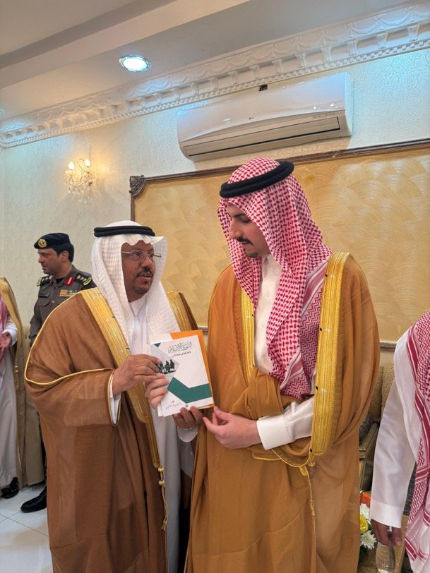 سمو الأمير فيصل بن بدر بن جلوي، محافظ محافظة بدر، يستقبل الدكتور حميد الأحمدي ويطّلع على إصداراته الفكرية حول الشورى والأمن الفكري