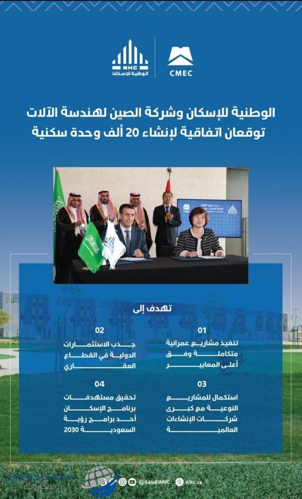 وقعت الشركة الوطنية للإسكان “NHC” في العاصمة الصينية بكين اتفاقية تعاون مع شركة الصين لهندسة الآلات CMEC لإنشاء 20 ألف وحدة سكنية ضمن الضواحي والمجتمعات السكنية التي تطورها الشركة، وذلك ضمن الزيارة الرسمية التي أجراها معالي وزير الشؤون البلدية والقروية والإسكان رئيس لجنة برنامج الإسكان الأستاذ ماجد بن عبدالله الحقيل لجمهورية الصين الشعبية.