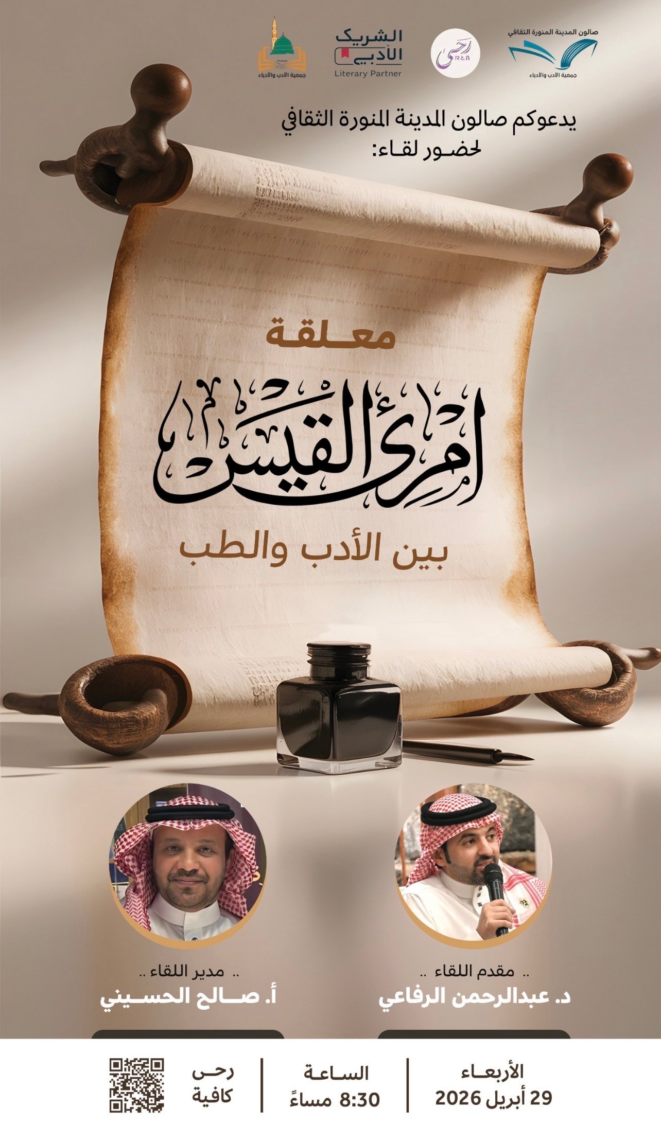 ينظم صالون المدينة المنورة الثقافي لقاء ثقافيا مميزا بعنوان (بين الأدب والطب: قراءة في معلّقة امرئ القيس)، وذلك ضمن برامجه الهادفة إلى تعزيز الحراك الثقافي وفتح مساحات للحوار بين الأدب والعلوم، في مقاربة فكرية تجمع بين التجربة الإنسانية والمعرفة المتخصصة.