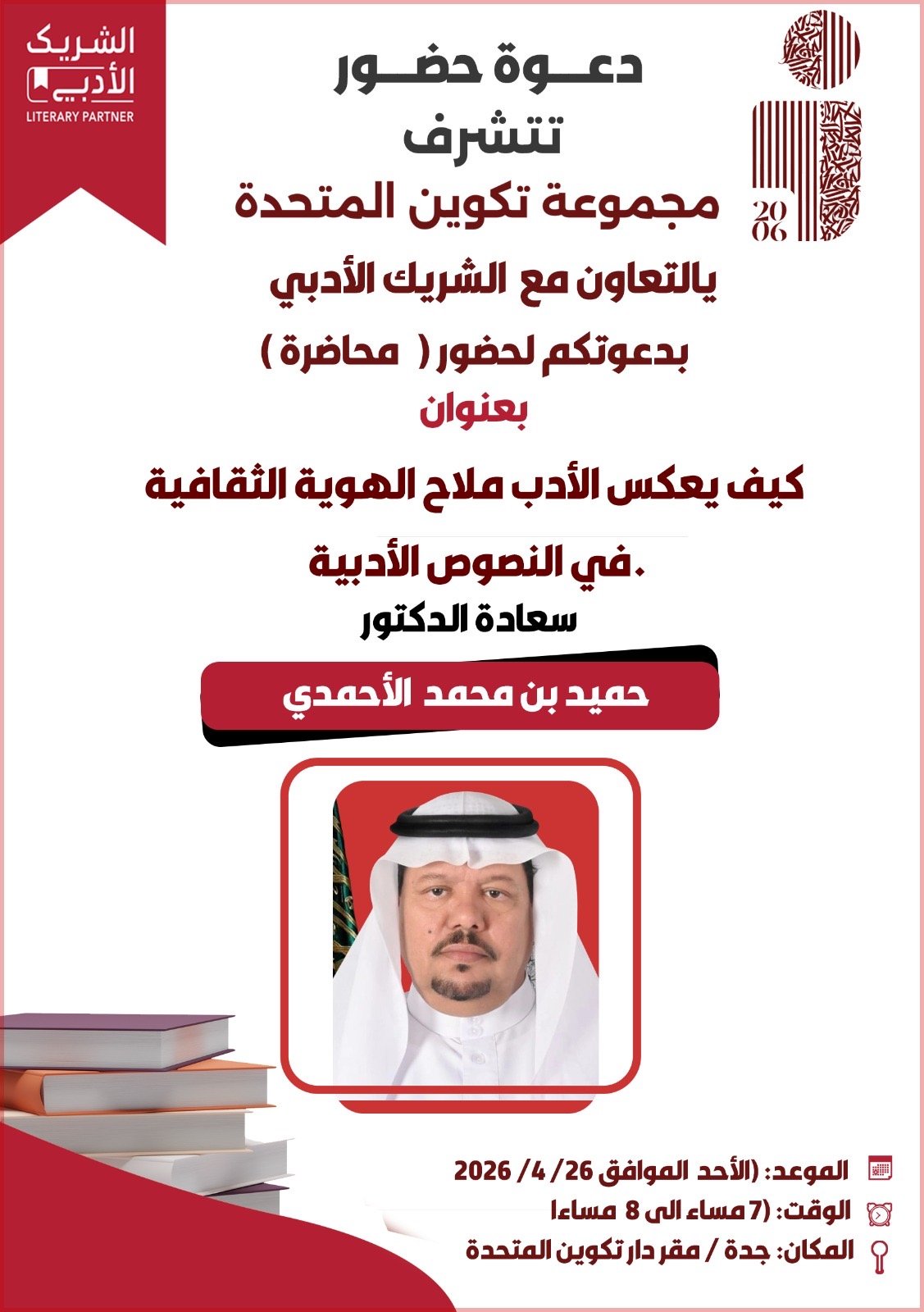 ويقدّم المحاضرة سعادة الدكتور حميد بن محمد الأحمدي، الذي يُعد من الأسماء الأكاديمية المعروفة في مجال الدراسات الأدبية والنقد الثقافي، حيث يتناول من خلالها العلاقة العميقة بين الأدب والهوية، وكيف تسهم النصوص الأدبية في تشكيل الوعي الثقافي للمجتمعات وتعكس خصوصيتها الحضارية.