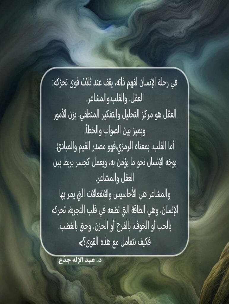 أما القلب، فهو الوسيط بينهما، يمنح العقل بوصلة معنوية، ويكبح جماح المشاعر كي لا تسيطر على القرار.