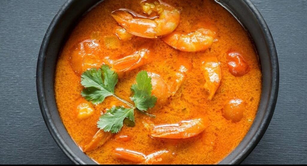 2. أضف معجون الكاري والبهارات، ثم الروبيان، وقلّب لمدة 5 دقائق.