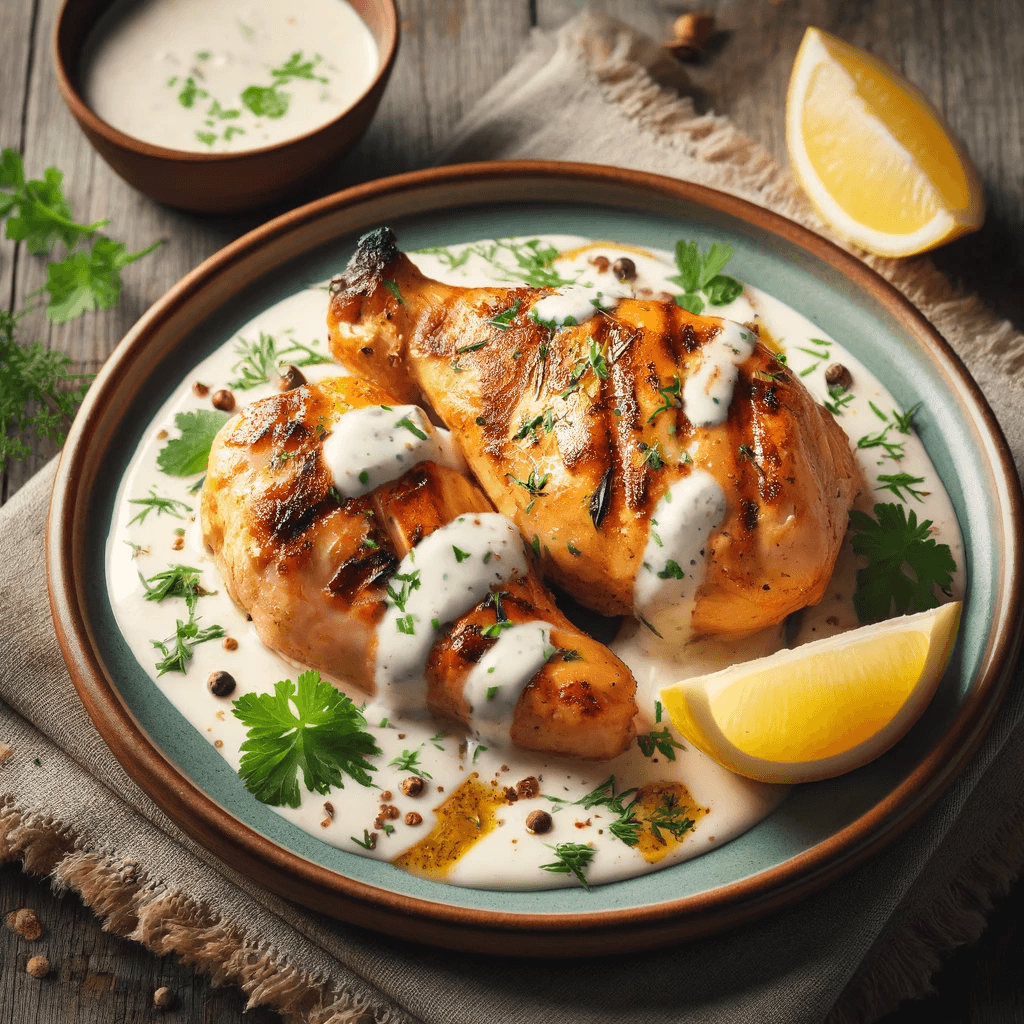 1. في وعاء، اخلطي الزبادي مع الثوم، البهارات، الليمون، والزيت.