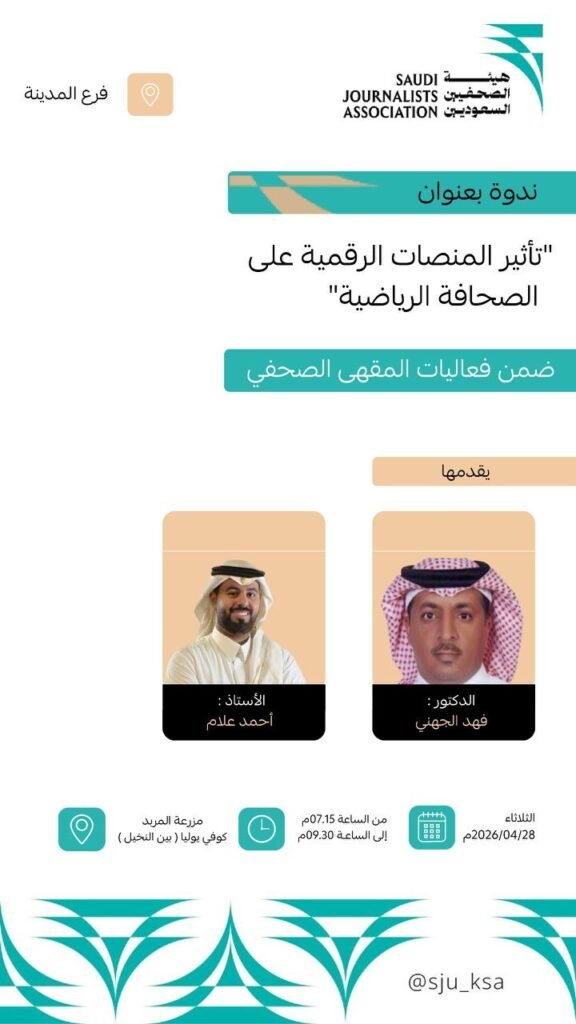 ينظّم فرع هيئة الصحفيين السعوديين بمنطقة المدينة المنورة، ضمن فعاليات “المقهى الصحفي”، ندوة متخصصة بعنوان (تأثير المنصات الرقمية على الصحافة الرياضية)، وذلك مساء يوم الثلاثاء الموافق 28 أبريل 2026م (11 ذو القعدة 1447هـ).
