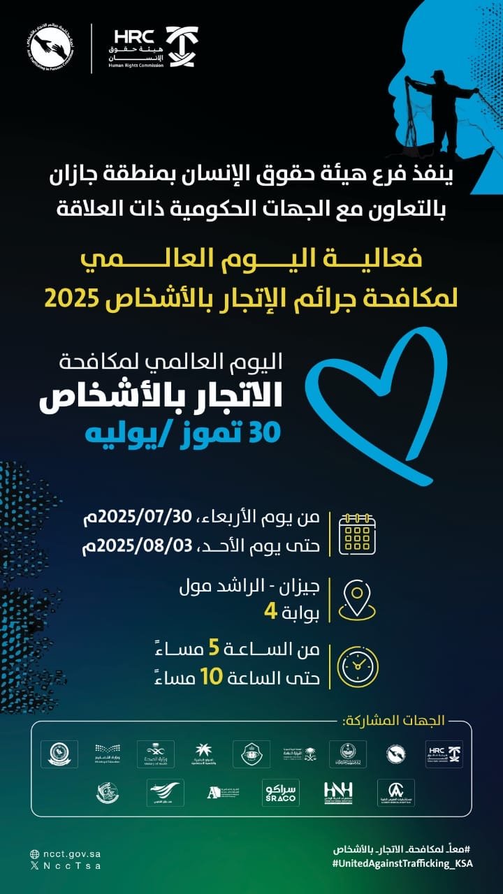 فرع هيئة حقوق الإنسان بجازان ينظم فعالية اليوم العالمي لمكافحة الاتجار بالأشخاص 2025 غداً