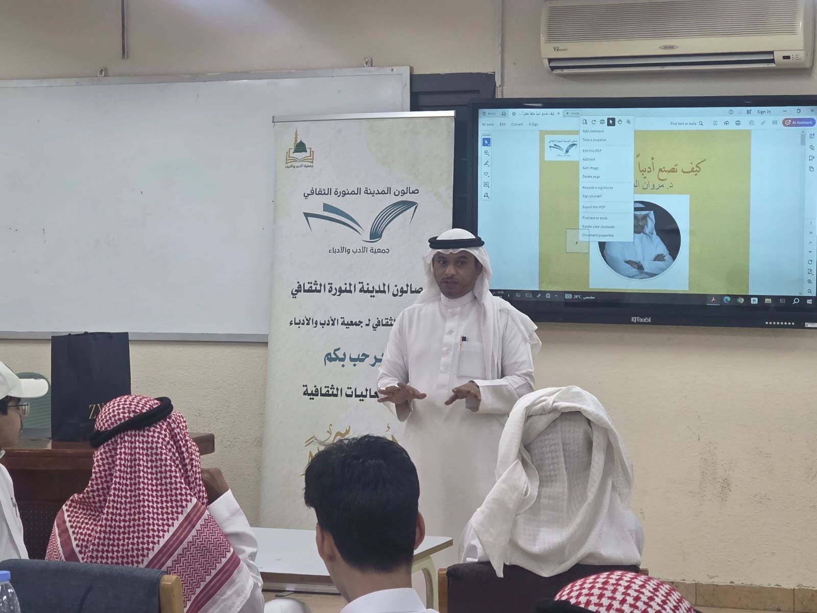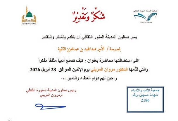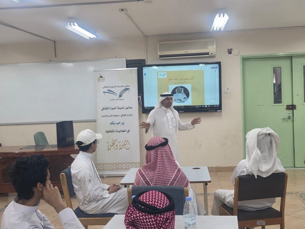 في إطار الشراكة الأدبية بين صالون المدينة المنورة الثقافي، الذراع الثقافي لـ جمعية الأدب والأدباء، وعدد من المدارس الثانوية، أقام رئيس الصالون الدكتور مروان المزيني لقاء ثقافيا بعنوان (كيف تصبح أديبا مثقفا مفكرا)، استهدف طلاب المرحلة الثانوية، في خطوة تهدف إلى اكتشاف المواهب الأدبية وصقلها وتوجيهها نحو مسارات إبداعية واعية.