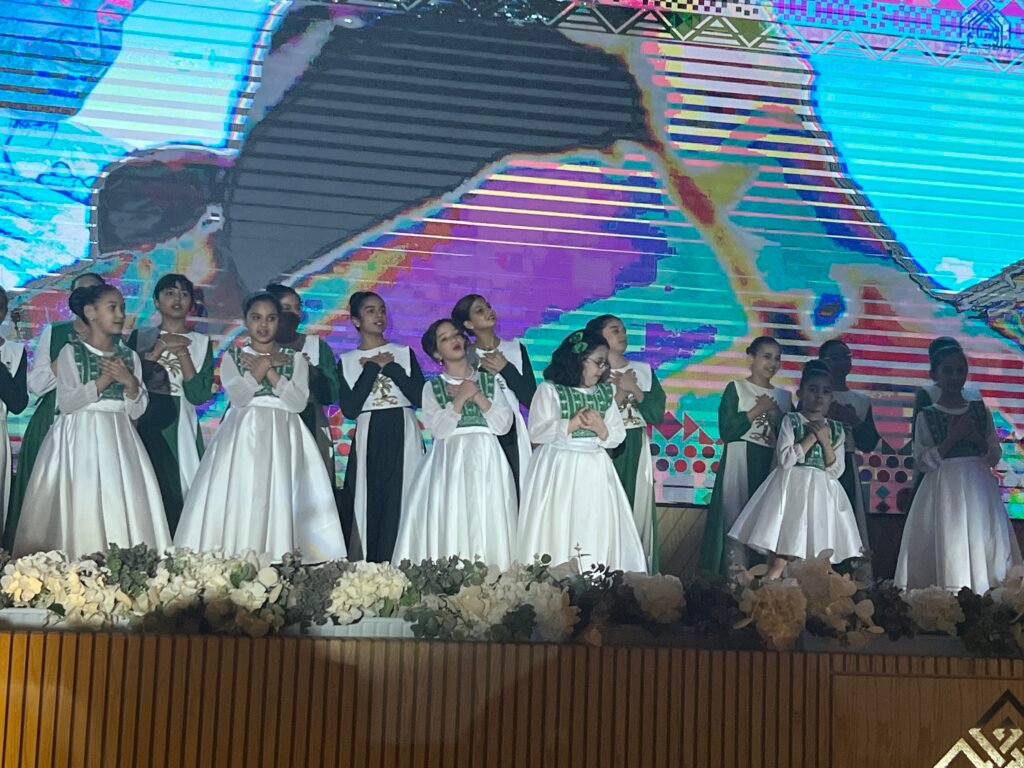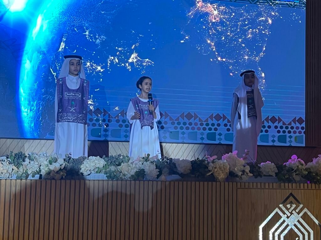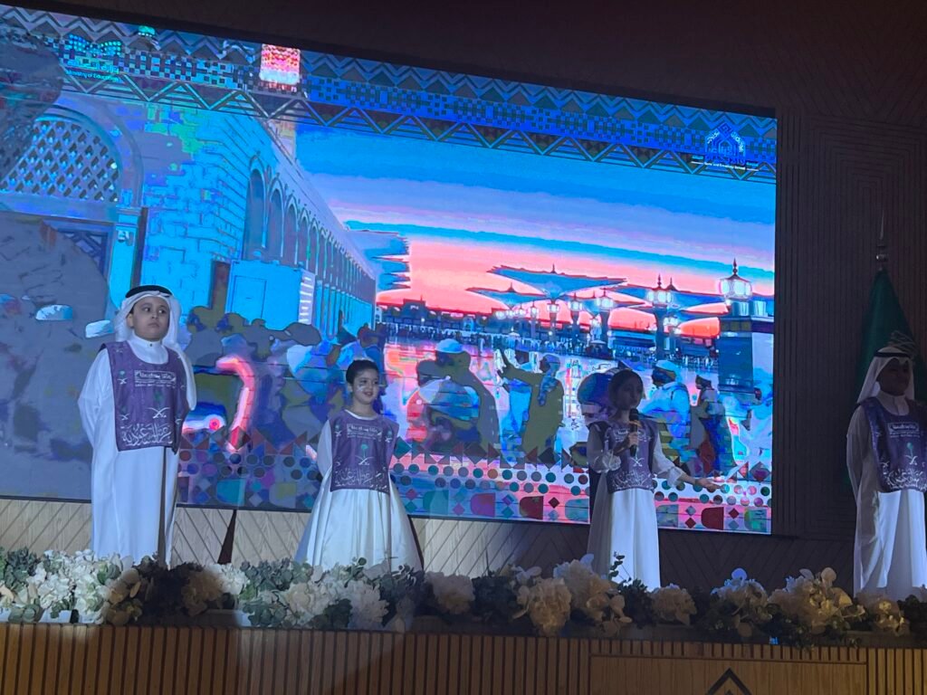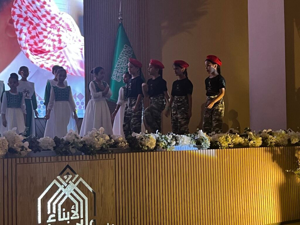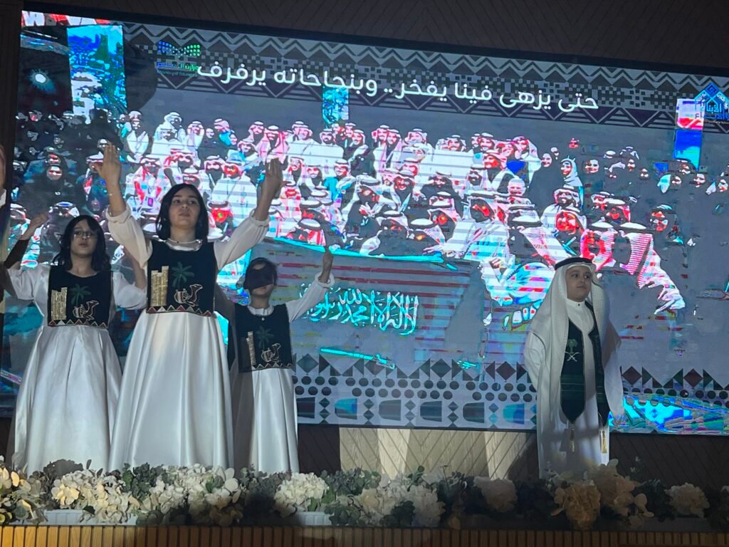 وانطلقت الأمسية الوطنية في تمام الساعة الثامنة مساء بالسلام الملكي السعودي الذي ترددت أصداؤه في أرجاء القاعة، إيذانا ببدء برنامج حافل جسّد معاني الفخر والانتماء. وقدّم الطلاب والطالبات أوبريتا وطنيا بعنوان “سلاما أيها الوطن الأعزُّ”، جاء بأداء جماعي مفعم بالحماس، جسّد معاني الاعتزاز بالهوية الوطنية وروح الولاء للقيادة، وتضمن لوحات إنشادية وفنية حملت في كلماتها روح العزيمة والانتماء.