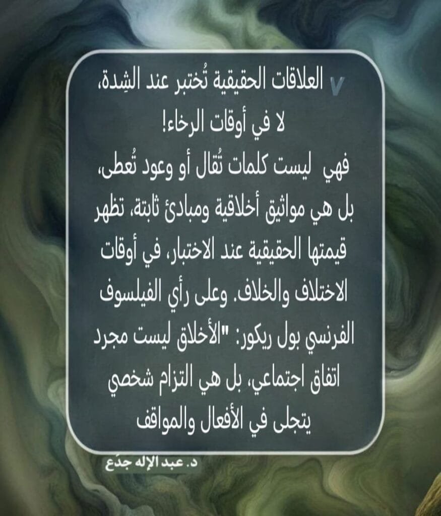 فهي ليست كلمات تُقال أو وعود تُعطى، بل هي مواثيق أخلاقية ومبادئ ثابتة، تظهر قيمتها الحقيقية عند الاختبار، في أوقات الاختلاف والخلاف. وعلى رأي الفيلسوف الفرنسي بول ريكور: “الأخلاق ليست مجرد اتفاق اجتماعي، بل هي التزام شخصي يتجلى في الأفعال والمواقف.