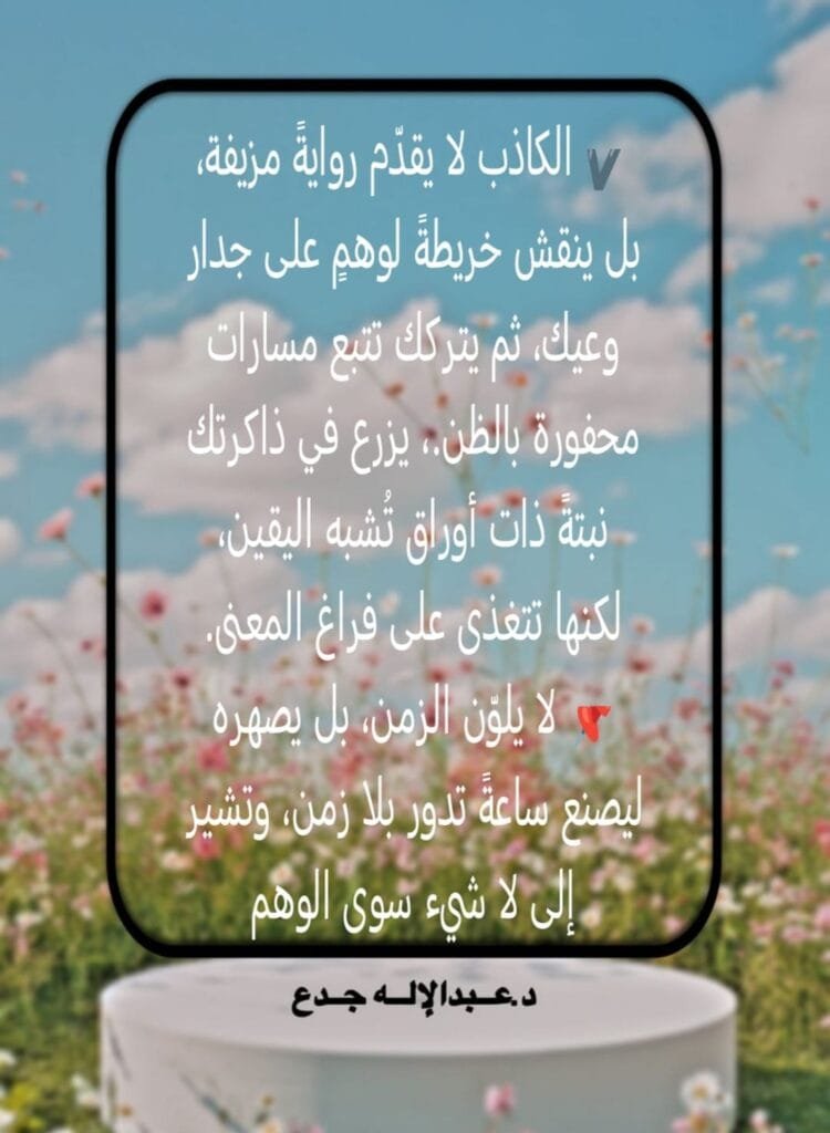 الكاذب لا يقدّم روايةً مزيفة، بل ينقش خريطةً لوهمٍ على جدار وعيك، ثم يتركك تتبع مسارات محفورة بالظن.، يزرع في ذاكرتك نبتةً ذات أوراق تُشبه اليقين، لكنها تتغذى على فراغ المعنى.