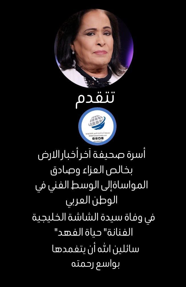 ببالغ الحزن والأسى، تنعى صحيفة آخر أخبار الأرض، ممثلة بفريق التحرير وجميع الكتّاب والكاتبات، رحيل قامة فنية كبيرة، تركت بصمة خالدة في وجدان الجمهور العربي والخليجي ، وأسهمت عبر مسيرتها الطويلة في إثراء المشهد الفني بأعمال ستبقى شاهدة على موهبتها وعطائها.